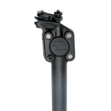 Diese gefederte Sattelstütze hat den Vorteil, dass sie kürzbar ist und auch in Rahmen verbaut werden kann, bei denen die Sattelstütze nicht beliebig tief versenkt werden kann.